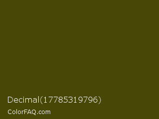 Decimal 17785319796 Color is a very dark yellow color and the nearest color is Bronze Olive #4e420c. Hex code #484706 and RGB value is rgb(72,71,6). In RGB color space, this color is composed of 28% red, 28% green, 2% blue, In CMYK color space, this color is composed of 0% cyan, 1% magenta, 92% yellow , 72% black , In HSL color space, this color has a hue angle of 59° , 85% saturation and 15% lightness.