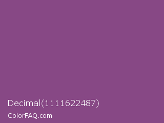 Decimal 1111622487 Color is a normal magenta color and the nearest color is Plum #8e4585. Hex code #874885 and RGB value is rgb(135,72,133). In RGB color space, this color is composed of 53% red, 28% green, 52% blue, In CMYK color space, this color is composed of 0% cyan, 47% magenta, 1% yellow , 47% black , In HSL color space, this color has a hue angle of 302° , 30% saturation and 41% lightness.