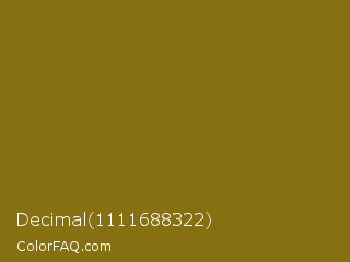 Decimal 1111688322 Color is a dark yellow color and the nearest color is Corn Harvest #8b6b0b. Hex code #877012 and RGB value is rgb(135,112,18). In RGB color space, this color is composed of 53% red, 44% green, 7% blue, In CMYK color space, this color is composed of 0% cyan, 17% magenta, 87% yellow , 47% black , In HSL color space, this color has a hue angle of 48° , 76% saturation and 30% lightness.