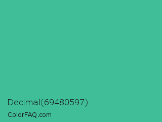 Decimal 69480597 Color is a normal green color and the nearest color is Ocean Green #48bf91. Hex code #40be97 and RGB value is rgb(64,190,151). In RGB color space, this color is composed of 25% red, 75% green, 59% blue, In CMYK color space, this color is composed of 66% cyan, 0% magenta, 21% yellow , 25% black , In HSL color space, this color has a hue angle of 161° , 50% saturation and 50% lightness.