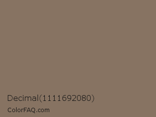 Decimal 1111692080 Color is a normal orange color and the nearest color is Cement #8d7662. Hex code #877362 and RGB value is rgb(135,115,98). In RGB color space, this color is composed of 53% red, 45% green, 38% blue, In CMYK color space, this color is composed of 0% cyan, 15% magenta, 27% yellow , 47% black , In HSL color space, this color has a hue angle of 28° , 16% saturation and 46% lightness.