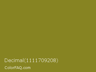 Decimal 1111709208 Color is a normal yellow color and the nearest color is Trendy Green #7c881a. Hex code #878422 and RGB value is rgb(135,132,34). In RGB color space, this color is composed of 53% red, 52% green, 13% blue, In CMYK color space, this color is composed of 0% cyan, 2% magenta, 75% yellow , 47% black , In HSL color space, this color has a hue angle of 58° , 60% saturation and 33% lightness.