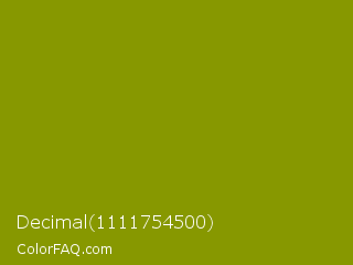 Decimal 1111754500 Color is a dark yellow color and the nearest color is Limeade #6f9d02. Hex code #879800 and RGB value is rgb(135,152,0). In RGB color space, this color is composed of 53% red, 60% green, 0% blue, In CMYK color space, this color is composed of 11% cyan, 0% magenta, 100% yellow , 40% black , In HSL color space, this color has a hue angle of 67° , 100% saturation and 30% lightness.