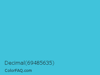 Decimal 69485635 Color is a normal cyan color and the nearest color is Sea Serpent #4bc7cf. Hex code #40c3db and RGB value is rgb(64,195,219). In RGB color space, this color is composed of 25% red, 76% green, 86% blue, In CMYK color space, this color is composed of 71% cyan, 11% magenta, 0% yellow , 14% black , In HSL color space, this color has a hue angle of 189° , 68% saturation and 55% lightness.
