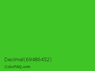 Decimal 69486452 Color is a normal green color and the nearest color is Harlequin Green #46cb18. Hex code #40c526 and RGB value is rgb(64,197,38). In RGB color space, this color is composed of 25% red, 77% green, 15% blue, In CMYK color space, this color is composed of 68% cyan, 0% magenta, 81% yellow , 23% black , In HSL color space, this color has a hue angle of 110° , 68% saturation and 46% lightness.