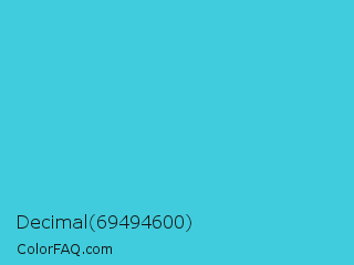 Decimal 69494600 Color is a normal cyan color and the nearest color is Sea Serpent #4bc7cf. Hex code #40ccdc and RGB value is rgb(64,204,220). In RGB color space, this color is composed of 25% red, 80% green, 86% blue, In CMYK color space, this color is composed of 71% cyan, 7% magenta, 0% yellow , 14% black , In HSL color space, this color has a hue angle of 186° , 69% saturation and 56% lightness.