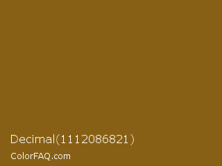 Decimal 1112086821 Color is a normal orange color and the nearest color is Grizzly #885818. Hex code #886015 and RGB value is rgb(136,96,21). In RGB color space, this color is composed of 53% red, 38% green, 8% blue, In CMYK color space, this color is composed of 0% cyan, 29% magenta, 85% yellow , 47% black , In HSL color space, this color has a hue angle of 39° , 73% saturation and 31% lightness.