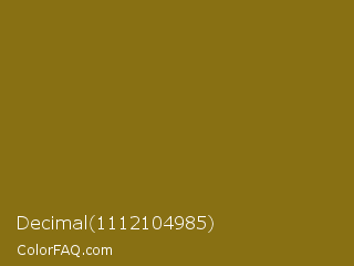 Decimal 1112104985 Color is a dark yellow color and the nearest color is Corn Harvest #8b6b0b. Hex code #887013 and RGB value is rgb(136,112,19). In RGB color space, this color is composed of 53% red, 44% green, 7% blue, In CMYK color space, this color is composed of 0% cyan, 18% magenta, 86% yellow , 47% black , In HSL color space, this color has a hue angle of 48° , 75% saturation and 30% lightness.