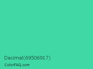 Decimal 69506917 Color is a normal green color and the nearest color is Eucalyptus #44d7a8. Hex code #40d8a5 and RGB value is rgb(64,216,165). In RGB color space, this color is composed of 25% red, 85% green, 65% blue, In CMYK color space, this color is composed of 70% cyan, 0% magenta, 24% yellow , 15% black , In HSL color space, this color has a hue angle of 160° , 66% saturation and 55% lightness.