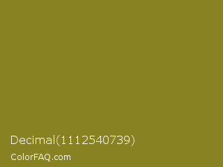 Decimal 1112540739 Color is a normal yellow color and the nearest color is Trendy Green #7c881a. Hex code #888223 and RGB value is rgb(136,130,35). In RGB color space, this color is composed of 53% red, 51% green, 14% blue, In CMYK color space, this color is composed of 0% cyan, 4% magenta, 74% yellow , 47% black , In HSL color space, this color has a hue angle of 56° , 59% saturation and 34% lightness.