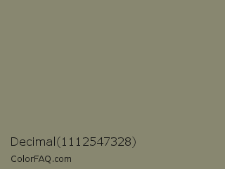 Decimal 1112547328 Color is a normal yellow color and the nearest color is Bandicoot #858470. Hex code #888770 and RGB value is rgb(136,135,112). In RGB color space, this color is composed of 53% red, 53% green, 44% blue, In CMYK color space, this color is composed of 0% cyan, 1% magenta, 18% yellow , 47% black , In HSL color space, this color has a hue angle of 58° , 10% saturation and 49% lightness.