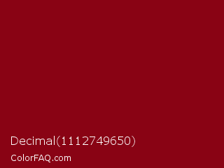 Decimal 1112749650 Color is a dark red color and the nearest color is Red Devil #860111. Hex code #890314 and RGB value is rgb(137,3,20). In RGB color space, this color is composed of 54% red, 1% green, 8% blue, In CMYK color space, this color is composed of 0% cyan, 98% magenta, 85% yellow , 46% black , In HSL color space, this color has a hue angle of 352° , 96% saturation and 27% lightness.