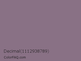 Decimal 1112938789 Color is a normal magenta color and the nearest color is Mobster #7f7589. Hex code #897185 and RGB value is rgb(137,113,133). In RGB color space, this color is composed of 54% red, 44% green, 52% blue, In CMYK color space, this color is composed of 0% cyan, 18% magenta, 3% yellow , 46% black , In HSL color space, this color has a hue angle of 310° , 10% saturation and 49% lightness.