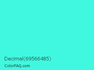 Decimal 69566485 Color is a light cyan color and the nearest color is Turquoise #40e0d0. Hex code #40f8df and RGB value is rgb(64,248,223). In RGB color space, this color is composed of 25% red, 97% green, 87% blue, In CMYK color space, this color is composed of 74% cyan, 0% magenta, 10% yellow , 3% black , In HSL color space, this color has a hue angle of 172° , 93% saturation and 61% lightness.