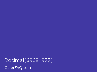 Decimal 69681977 Color is a normal indigo color and the nearest color is Blue Pigment #333399. Hex code #4138a3 and RGB value is rgb(65,56,163). In RGB color space, this color is composed of 25% red, 22% green, 64% blue, In CMYK color space, this color is composed of 60% cyan, 66% magenta, 0% yellow , 36% black , In HSL color space, this color has a hue angle of 245° , 49% saturation and 43% lightness.