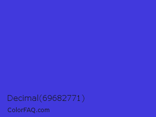 Decimal 69682771 Color is a normal indigo color and the nearest color is Palatinate Blue #273be2. Hex code #4139dd and RGB value is rgb(65,57,221). In RGB color space, this color is composed of 25% red, 22% green, 87% blue, In CMYK color space, this color is composed of 71% cyan, 74% magenta, 0% yellow , 13% black , In HSL color space, this color has a hue angle of 243° , 71% saturation and 55% lightness.