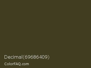 Decimal 69686409 Color is a very dark yellow color and the nearest color is Lisbon Brown #423921. Hex code #413d21 and RGB value is rgb(65,61,33). In RGB color space, this color is composed of 25% red, 24% green, 13% blue, In CMYK color space, this color is composed of 0% cyan, 6% magenta, 49% yellow , 75% black , In HSL color space, this color has a hue angle of 53° , 33% saturation and 19% lightness.