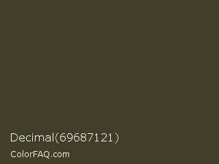 Decimal 69687121 Color is a very dark yellow color and the nearest color is Lisbon Brown #423921. Hex code #413e27 and RGB value is rgb(65,62,39). In RGB color space, this color is composed of 25% red, 24% green, 15% blue, In CMYK color space, this color is composed of 0% cyan, 5% magenta, 40% yellow , 75% black , In HSL color space, this color has a hue angle of 53° , 25% saturation and 20% lightness.