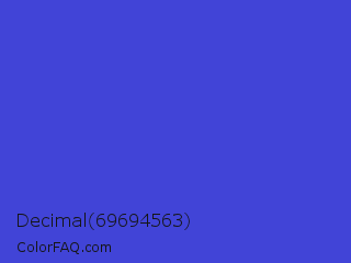 Decimal 69694563 Color is a normal blue color and the nearest color is Iris #5a4fcf. Hex code #4144d7 and RGB value is rgb(65,68,215). In RGB color space, this color is composed of 25% red, 27% green, 84% blue, In CMYK color space, this color is composed of 70% cyan, 68% magenta, 0% yellow , 16% black , In HSL color space, this color has a hue angle of 239° , 65% saturation and 55% lightness.