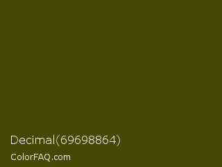 Decimal 69698864 Color is a very dark yellow color and the nearest color is Verdun Green #495400. Hex code #414902 and RGB value is rgb(65,73,2). In RGB color space, this color is composed of 25% red, 29% green, 1% blue, In CMYK color space, this color is composed of 11% cyan, 0% magenta, 97% yellow , 71% black , In HSL color space, this color has a hue angle of 67° , 95% saturation and 15% lightness.