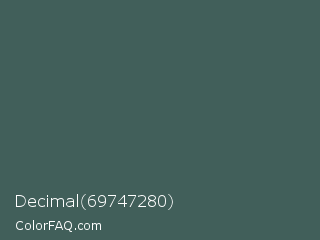 Decimal 69747280 Color is a normal cyan color and the nearest color is Mineral Green #3f5d53. Hex code #415f5a and RGB value is rgb(65,95,90). In RGB color space, this color is composed of 25% red, 37% green, 35% blue, In CMYK color space, this color is composed of 32% cyan, 0% magenta, 5% yellow , 63% black , In HSL color space, this color has a hue angle of 170° , 19% saturation and 31% lightness.