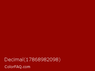 Decimal 17868982098 Color is a dark red color and the nearest color is Crimson Red #990000. Hex code #940400 and RGB value is rgb(148,4,0). In RGB color space, this color is composed of 58% red, 2% green, 0% blue, In CMYK color space, this color is composed of 0% cyan, 97% magenta, 100% yellow , 42% black , In HSL color space, this color has a hue angle of 2° , 100% saturation and 29% lightness.