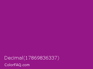 Decimal 17869836337 Color is a normal magenta color and the nearest color is Violet Eggplant #991199. Hex code #951687 and RGB value is rgb(149,22,135). In RGB color space, this color is composed of 58% red, 9% green, 53% blue, In CMYK color space, this color is composed of 0% cyan, 85% magenta, 9% yellow , 42% black , In HSL color space, this color has a hue angle of 307° , 74% saturation and 34% lightness.