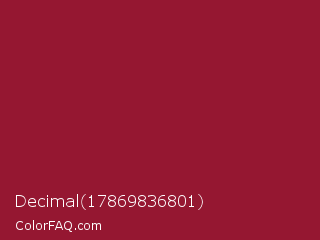 Decimal 17869836801 Color is a normal red color and the nearest color is Vivid Burgundy #9f1d35. Hex code #951731 and RGB value is rgb(149,23,49). In RGB color space, this color is composed of 58% red, 9% green, 19% blue, In CMYK color space, this color is composed of 0% cyan, 85% magenta, 67% yellow , 42% black , In HSL color space, this color has a hue angle of 348° , 73% saturation and 34% lightness.