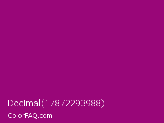 Decimal 17872293988 Color is a normal magenta color and the nearest color is Flirt #a2006d. Hex code #990678 and RGB value is rgb(153,6,120). In RGB color space, this color is composed of 60% red, 2% green, 47% blue, In CMYK color space, this color is composed of 0% cyan, 96% magenta, 22% yellow , 40% black , In HSL color space, this color has a hue angle of 313° , 92% saturation and 31% lightness.
