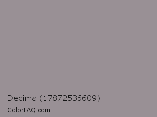 Decimal 17872536609 Color is a normal magenta color and the nearest color is Mountain Mist #959396. Hex code #999095 and RGB value is rgb(153,144,149). In RGB color space, this color is composed of 60% red, 56% green, 58% blue, In CMYK color space, this color is composed of 0% cyan, 6% magenta, 3% yellow , 40% black , In HSL color space, this color has a hue angle of 327° , 4% saturation and 58% lightness.