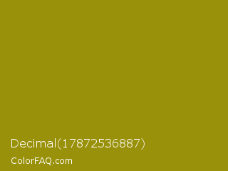 Decimal 17872536887 Color is a normal yellow color and the nearest color is Dark Yellow #9b870c. Hex code #999109 and RGB value is rgb(153,145,9). In RGB color space, this color is composed of 60% red, 57% green, 4% blue, In CMYK color space, this color is composed of 0% cyan, 5% magenta, 94% yellow , 40% black , In HSL color space, this color has a hue angle of 57° , 89% saturation and 32% lightness.