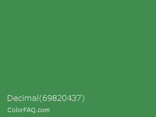 Decimal 69820437 Color is a normal green color and the nearest color is Middle Green #4d8c57. Hex code #418d4f and RGB value is rgb(65,141,79). In RGB color space, this color is composed of 25% red, 55% green, 31% blue, In CMYK color space, this color is composed of 54% cyan, 0% magenta, 44% yellow , 45% black , In HSL color space, this color has a hue angle of 131° , 37% saturation and 40% lightness.