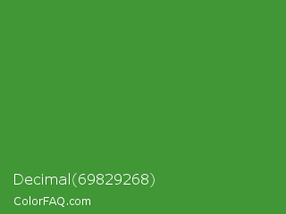 Decimal 69829268 Color is a normal green color and the nearest color is May Green #4c9141. Hex code #419636 and RGB value is rgb(65,150,54). In RGB color space, this color is composed of 25% red, 59% green, 21% blue, In CMYK color space, this color is composed of 57% cyan, 0% magenta, 64% yellow , 41% black , In HSL color space, this color has a hue angle of 113° , 47% saturation and 40% lightness.
