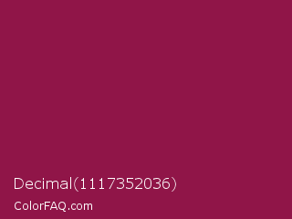 Decimal 1117352036 Color is a normal rose color and the nearest color is Disco #871550. Hex code #901548 and RGB value is rgb(144,21,72). In RGB color space, this color is composed of 56% red, 8% green, 28% blue, In CMYK color space, this color is composed of 0% cyan, 85% magenta, 50% yellow , 44% black , In HSL color space, this color has a hue angle of 335° , 75% saturation and 32% lightness.