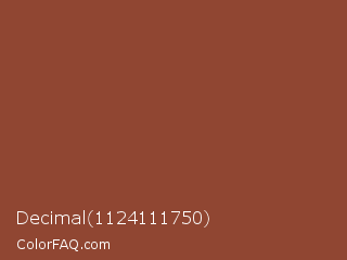 Decimal 1124111750 Color is a normal red color and the nearest color is Mule Fawn #8c472f. Hex code #904632 and RGB value is rgb(144,70,50). In RGB color space, this color is composed of 56% red, 27% green, 20% blue, In CMYK color space, this color is composed of 0% cyan, 51% magenta, 65% yellow , 44% black , In HSL color space, this color has a hue angle of 13° , 48% saturation and 38% lightness.