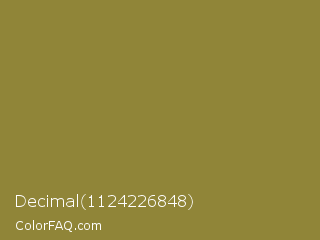 Decimal 1124226848 Color is a normal yellow color and the nearest color is Sycamore #908d39. Hex code #908538 and RGB value is rgb(144,133,56). In RGB color space, this color is composed of 56% red, 52% green, 22% blue, In CMYK color space, this color is composed of 0% cyan, 8% magenta, 61% yellow , 44% black , In HSL color space, this color has a hue angle of 53° , 44% saturation and 39% lightness.