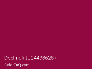 Decimal 1124438628 Color is a dark rose color and the nearest color is Pink Raspberry #980036. Hex code #910840 and RGB value is rgb(145,8,64). In RGB color space, this color is composed of 57% red, 3% green, 25% blue, In CMYK color space, this color is composed of 0% cyan, 94% magenta, 56% yellow , 43% black , In HSL color space, this color has a hue angle of 335° , 90% saturation and 30% lightness.