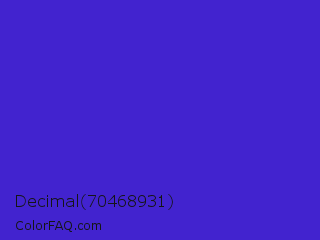 Decimal 70468931 Color is a normal indigo color and the nearest color is Interdimensional Blue #360ccc. Hex code #4223cf and RGB value is rgb(66,35,207). In RGB color space, this color is composed of 26% red, 14% green, 81% blue, In CMYK color space, this color is composed of 68% cyan, 83% magenta, 0% yellow , 19% black , In HSL color space, this color has a hue angle of 251° , 71% saturation and 47% lightness.