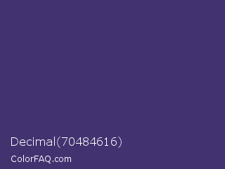 Decimal 70484616 Color is a normal indigo color and the nearest color is Jacarta #3a2a6a. Hex code #423270 and RGB value is rgb(66,50,112). In RGB color space, this color is composed of 26% red, 20% green, 44% blue, In CMYK color space, this color is composed of 41% cyan, 55% magenta, 0% yellow , 56% black , In HSL color space, this color has a hue angle of 255° , 38% saturation and 32% lightness.
