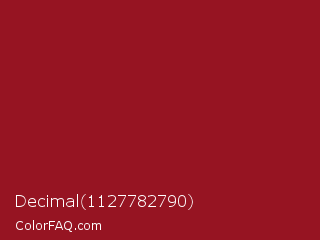 Decimal 1127782790 Color is a normal red color and the nearest color is Ruby Red #9b111e. Hex code #961422 and RGB value is rgb(150,20,34). In RGB color space, this color is composed of 59% red, 8% green, 13% blue, In CMYK color space, this color is composed of 0% cyan, 87% magenta, 77% yellow , 41% black , In HSL color space, this color has a hue angle of 354° , 76% saturation and 33% lightness.