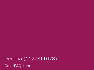 Decimal 1127811078 Color is a normal rose color and the nearest color is Disco #871550. Hex code #961756 and RGB value is rgb(150,23,86). In RGB color space, this color is composed of 59% red, 9% green, 34% blue, In CMYK color space, this color is composed of 0% cyan, 85% magenta, 43% yellow , 41% black , In HSL color space, this color has a hue angle of 330° , 73% saturation and 34% lightness.