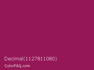 Decimal 1127811080 Color is a normal rose color and the nearest color is Disco #871550. Hex code #961758 and RGB value is rgb(150,23,88). In RGB color space, this color is composed of 59% red, 9% green, 35% blue, In CMYK color space, this color is composed of 0% cyan, 85% magenta, 41% yellow , 41% black , In HSL color space, this color has a hue angle of 329° , 73% saturation and 34% lightness.