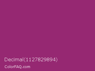 Decimal 1127829894 Color is a normal magenta color and the nearest color is Amaranth Deep Purple #9f2b68. Hex code #962872 and RGB value is rgb(150,40,114). In RGB color space, this color is composed of 59% red, 16% green, 45% blue, In CMYK color space, this color is composed of 0% cyan, 73% magenta, 24% yellow , 41% black , In HSL color space, this color has a hue angle of 320° , 58% saturation and 37% lightness.