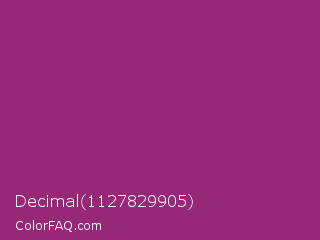 Decimal 1127829905 Color is a normal magenta color and the nearest color is Amaranth Deep Purple #9f2b68. Hex code #962877 and RGB value is rgb(150,40,119). In RGB color space, this color is composed of 59% red, 16% green, 47% blue, In CMYK color space, this color is composed of 0% cyan, 73% magenta, 21% yellow , 41% black , In HSL color space, this color has a hue angle of 317° , 58% saturation and 37% lightness.