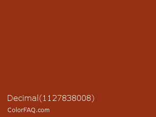 Decimal 1127838008 Color is a normal red color and the nearest color is Tabasco #a02712. Hex code #963012 and RGB value is rgb(150,48,18). In RGB color space, this color is composed of 59% red, 19% green, 7% blue, In CMYK color space, this color is composed of 0% cyan, 68% magenta, 88% yellow , 41% black , In HSL color space, this color has a hue angle of 14° , 79% saturation and 33% lightness.