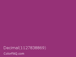 Decimal 1127838869 Color is a normal magenta color and the nearest color is Razzmic Berry Crayola #843179. Hex code #963177 and RGB value is rgb(150,49,119). In RGB color space, this color is composed of 59% red, 19% green, 47% blue, In CMYK color space, this color is composed of 0% cyan, 67% magenta, 21% yellow , 41% black , In HSL color space, this color has a hue angle of 318° , 51% saturation and 39% lightness.
