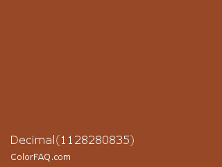 Decimal 1128280835 Color is a normal orange color and the nearest color is Cumin #924321. Hex code #964827 and RGB value is rgb(150,72,39). In RGB color space, this color is composed of 59% red, 28% green, 15% blue, In CMYK color space, this color is composed of 0% cyan, 52% magenta, 74% yellow , 41% black , In HSL color space, this color has a hue angle of 18° , 59% saturation and 37% lightness.