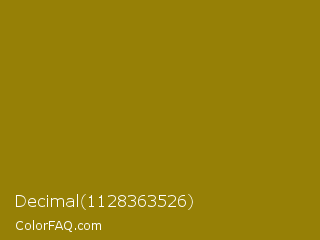 Decimal 1128363526 Color is a normal yellow color and the nearest color is Dark Yellow #9b870c. Hex code #968006 and RGB value is rgb(150,128,6). In RGB color space, this color is composed of 59% red, 50% green, 2% blue, In CMYK color space, this color is composed of 0% cyan, 15% magenta, 96% yellow , 41% black , In HSL color space, this color has a hue angle of 51° , 92% saturation and 31% lightness.