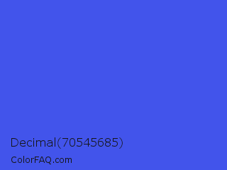 Decimal 70545685 Color is a normal blue color and the nearest color is Ultramarine Blue #4166f5. Hex code #4254eb and RGB value is rgb(66,84,235). In RGB color space, this color is composed of 26% red, 33% green, 92% blue, In CMYK color space, this color is composed of 72% cyan, 64% magenta, 0% yellow , 8% black , In HSL color space, this color has a hue angle of 234° , 81% saturation and 59% lightness.
