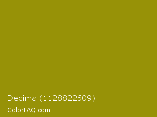 Decimal 1128822609 Color is a normal yellow color and the nearest color is Dark Yellow #9b870c. Hex code #979207 and RGB value is rgb(151,146,7). In RGB color space, this color is composed of 59% red, 57% green, 3% blue, In CMYK color space, this color is composed of 0% cyan, 3% magenta, 95% yellow , 41% black , In HSL color space, this color has a hue angle of 58° , 91% saturation and 31% lightness.
